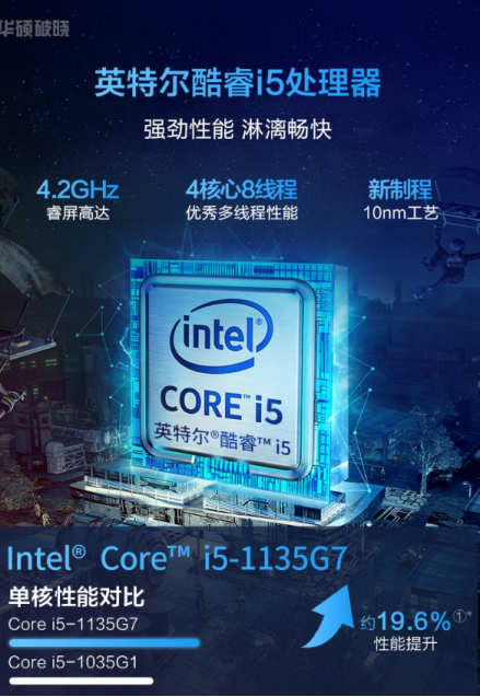 满足了用户出门携带电脑的便携性和长续航需求,接下来考验的就是产品的性能,这一点华硕破晓Pro14绝对不会让你失望。华硕破晓pro14笔记本,搭载第十一代英特尔®i5-1135G7酷睿™处理器,采用4核8线程设计,最高睿频可达4.2Ghz,出色的性能支撑保证用户在外出办公时,可以轻松地进行文档校对,资料查询,网页多开等工作处理;并在16G内存+512G 高速固态的加持下,有效提升大型软件和系统的响应速度,让用户在酒店、快餐店等不稳定的环境下,接通网络一样可以高效办公。